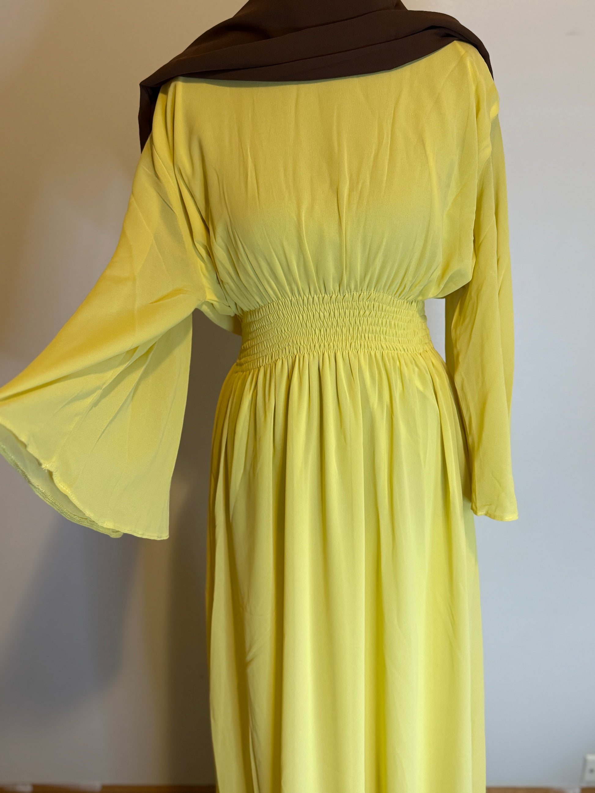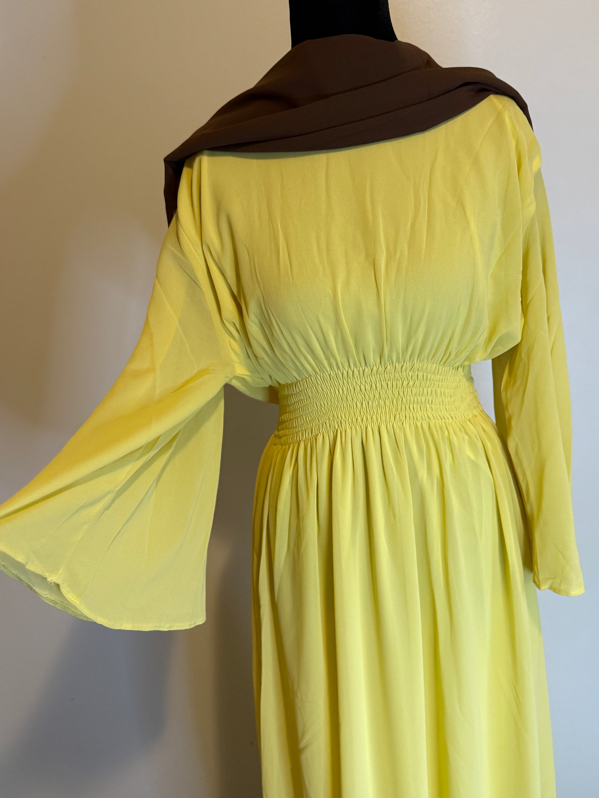 Butter yellow dress with brown hijab