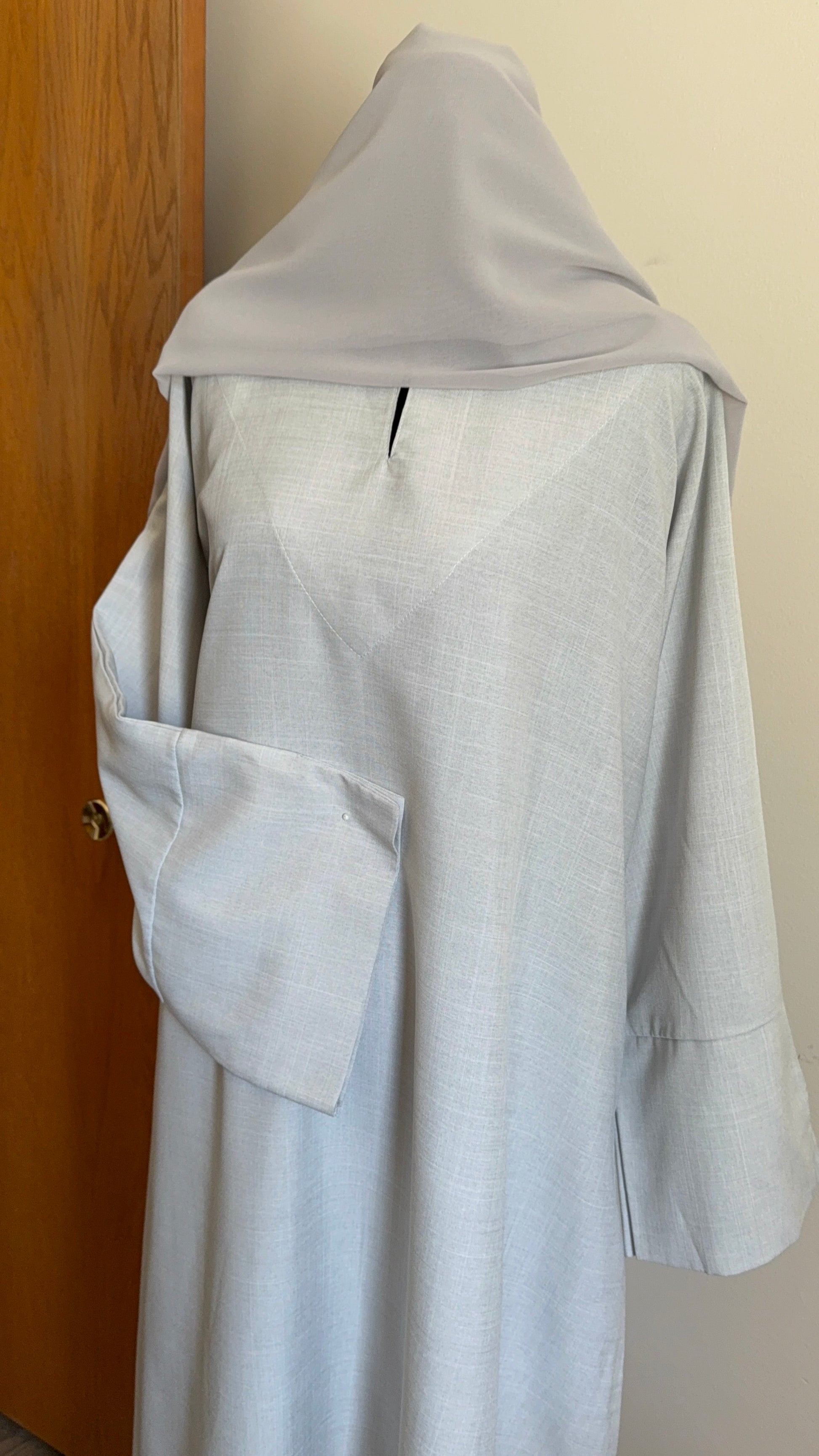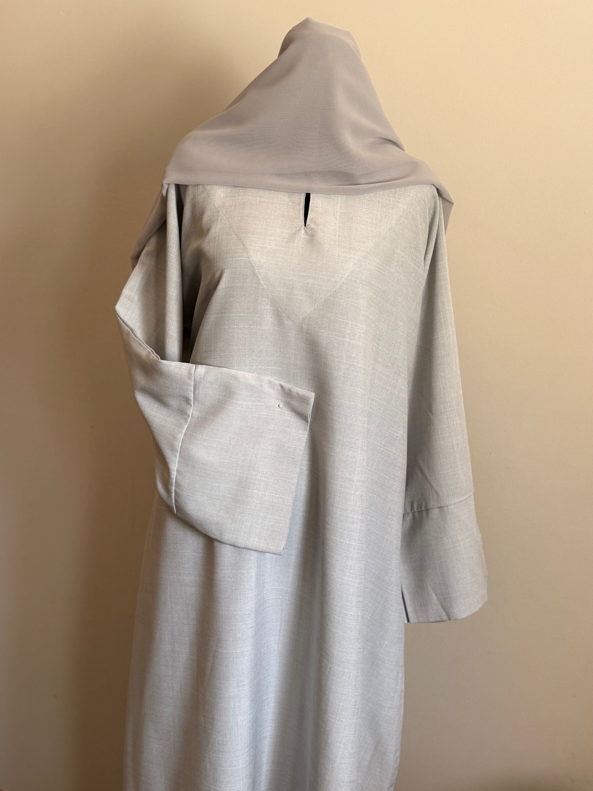 The Lunar Stone abaya features lightweight light gray linen paired with a chiffon matching hijab. Designed with practical pockets, it combines modest style and everyday functionality.