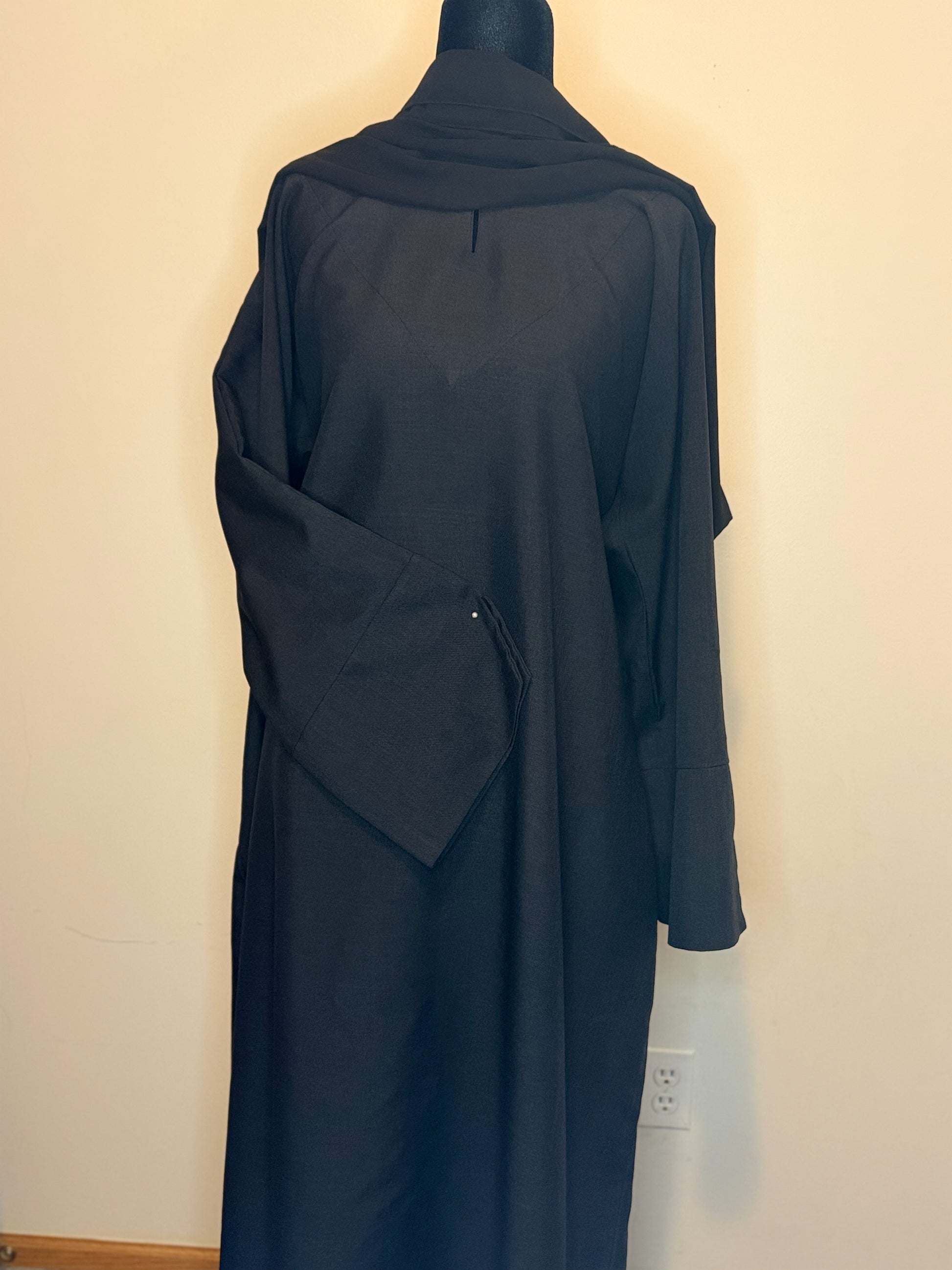 The Midnight abaya is crafted from breathable black linen, offering comfort and elegance. It includes two practical pockets for convenience. Paired with a matching chiffon hijab, this set delivers a refined, cohesive look suitable for both everyday wear and special occasions.