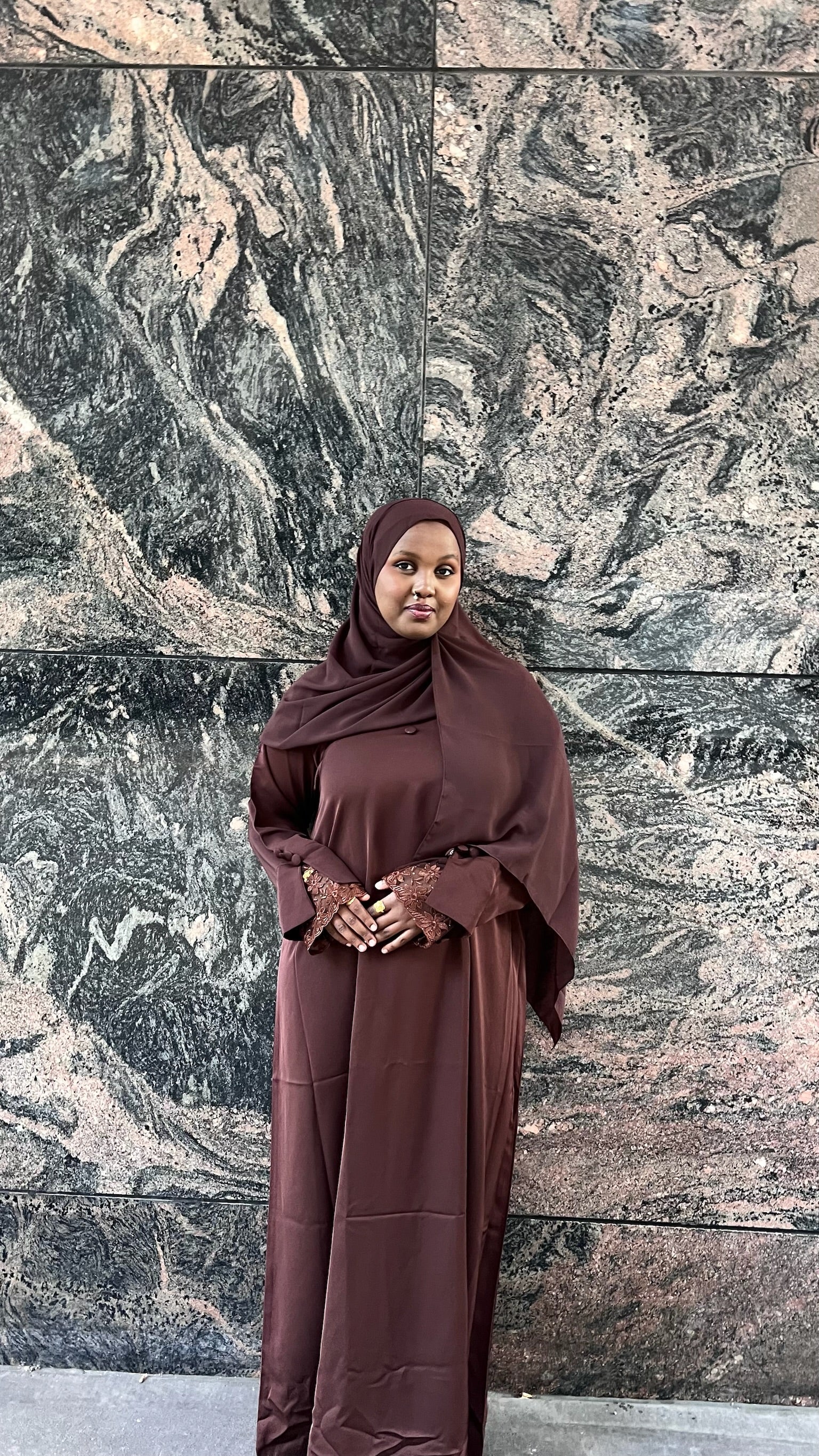The Rosewood Lace abaya features a refined chocolate brown hue complemented by a matching hijab, creating a harmonious and elegant look. Delicate lace detailing on the sleeves adds a sophisticated touch, enhancing the garment’s graceful silhouette. This set offers both modesty and style, perfectly suited for those seeking understated elegance with intricate craftsmanship.